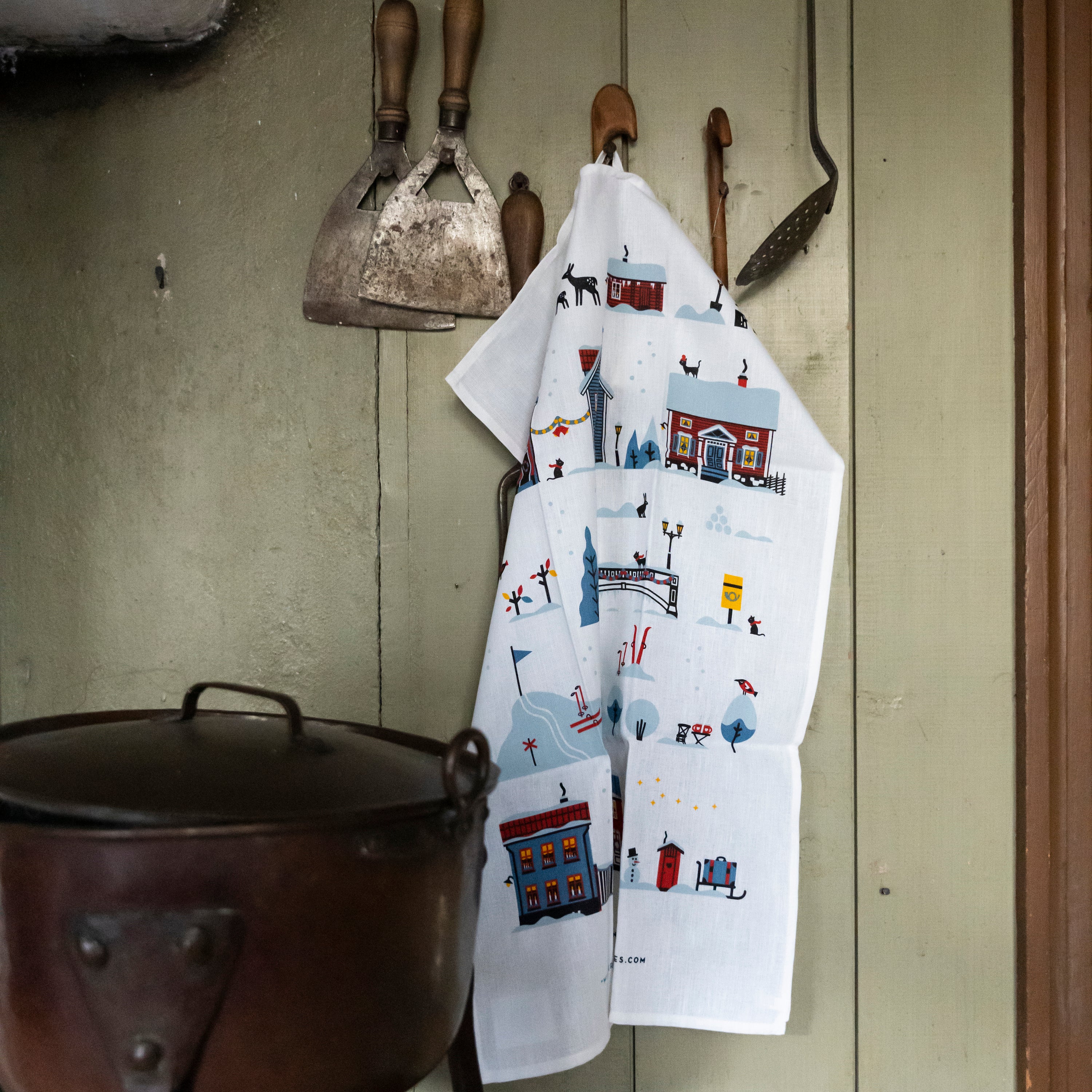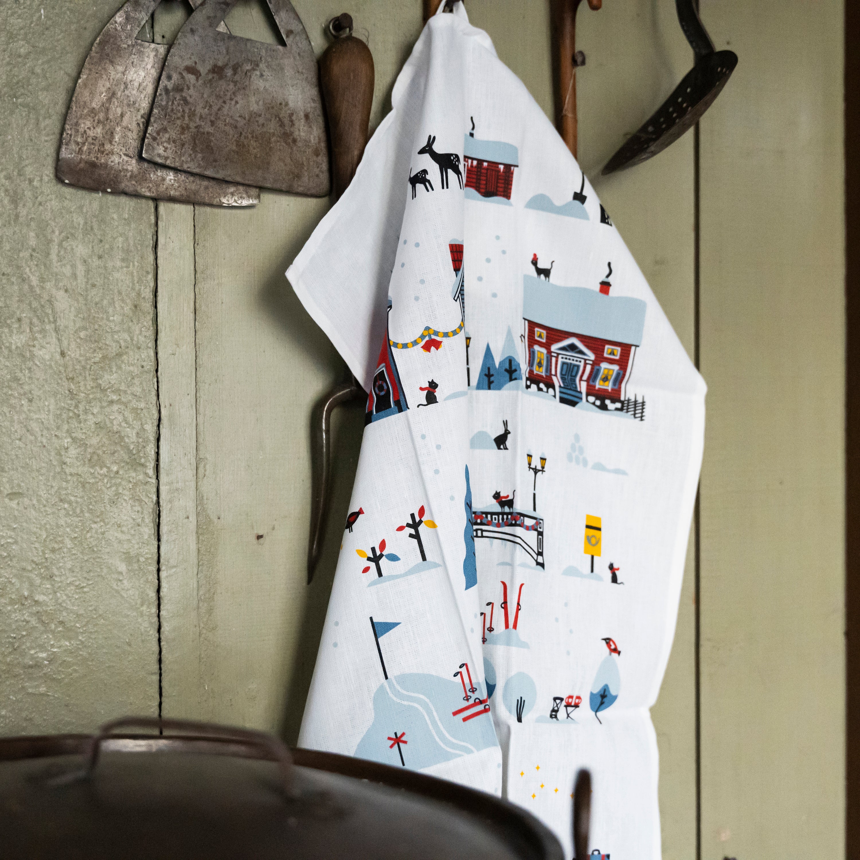 Kökshandduk med härligt vintermotiv av klassiska skandinaviska hus i vinterskrud. Tillverkad av 50% bomull och 50% lin, tryckt med vattenlösliga och miljövänliga färger i Sverige. Passar perfekt i köket under vintermånaderna.