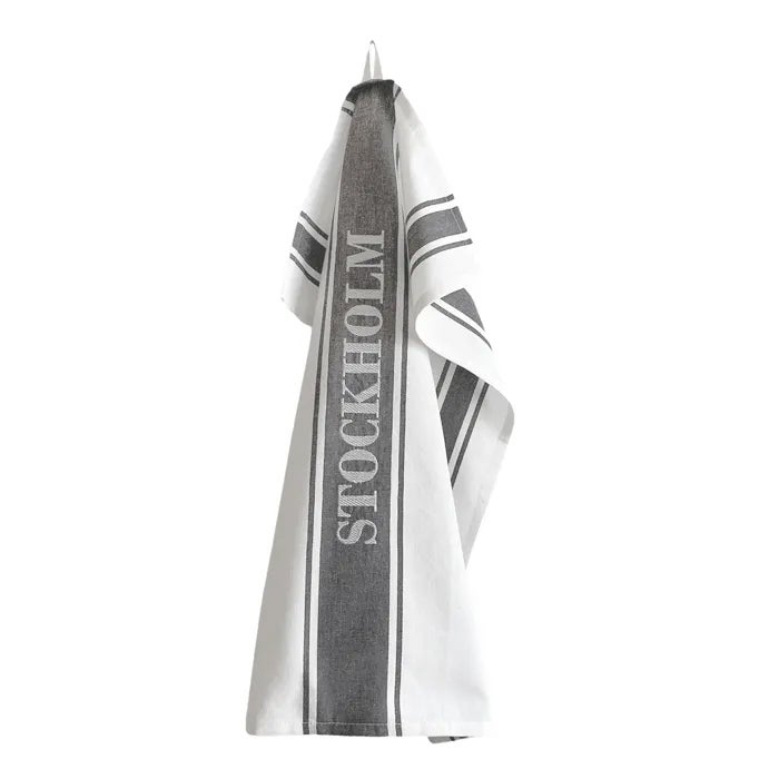 Jacquardvävd kökshandduk i 100% bomull med gråa ränder och broderad text ”Stockholm” i mitten. Den täta väven ger en gedigen känsla och hög slitstyrka, medan den absorberande bomullen gör handduken perfekt för att torka händer eller disk. En stilren detalj i köket och en uppskattad present vid inflyttning eller till någon som älskar Stockholm.