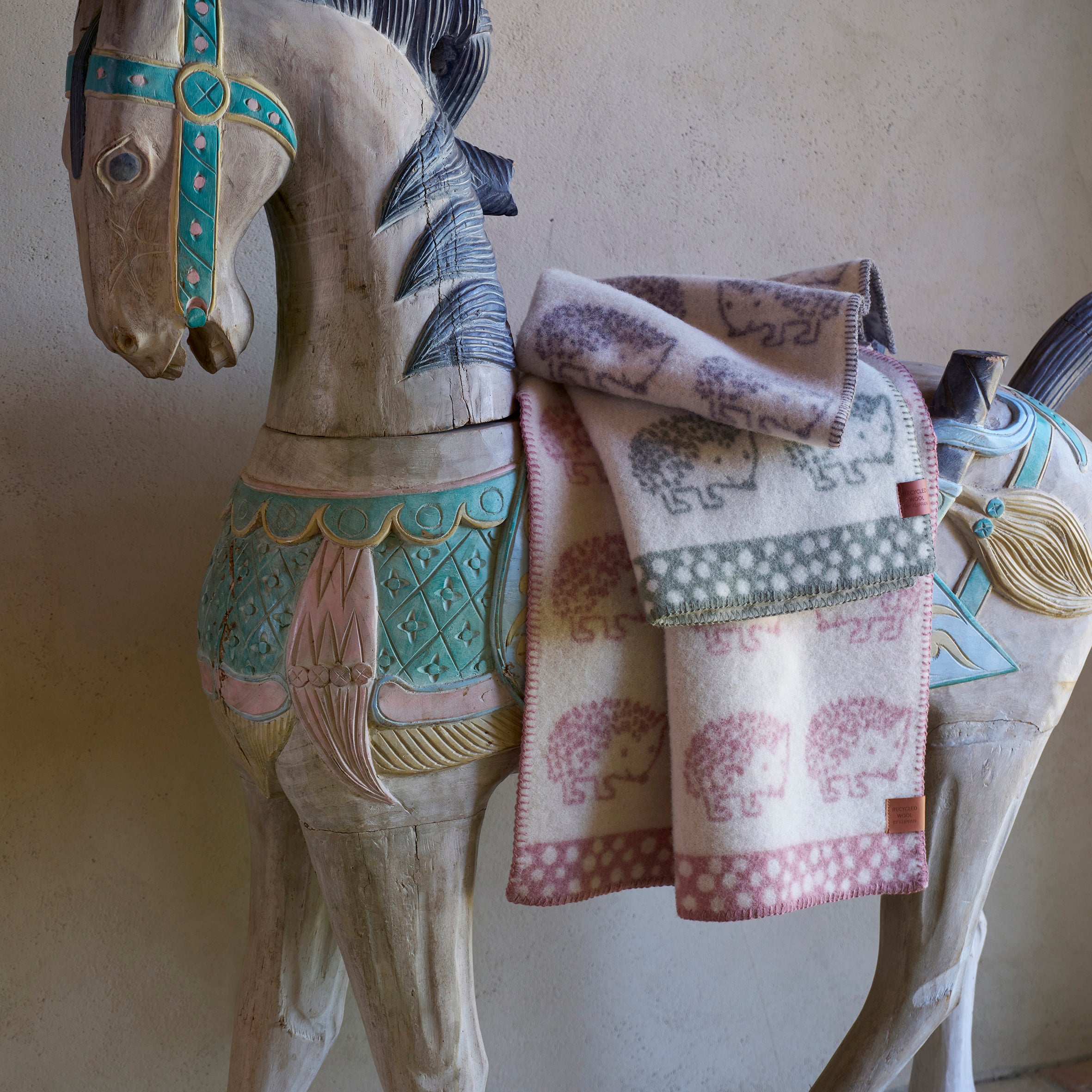 Gosig barnpläd från Klippans Yllefabrik, designad av Bitte Stenström och tillverkad i 50% återvunnen ull och 50% ekologisk lammull. Filten har ett charmigt mönster med små igelkottar och är både mysig och skön, perfekt för barnvagnspromenaden.