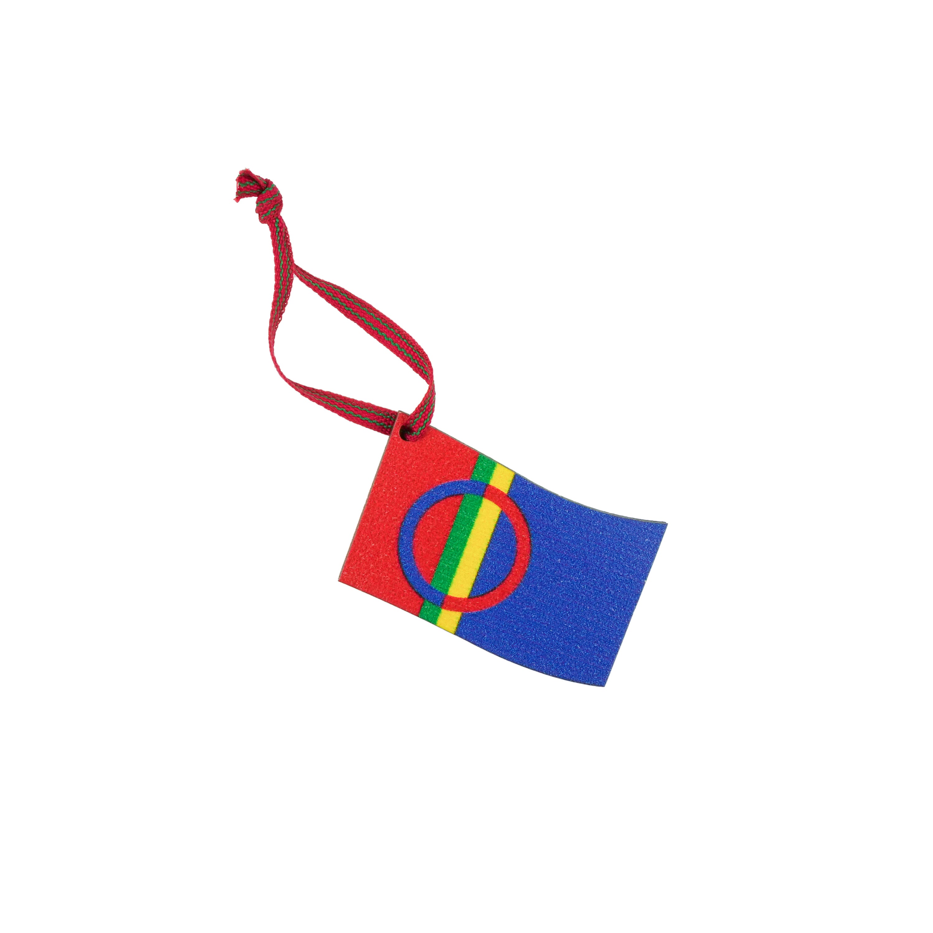 Den samiska flaggan i trä med sameband. Fin att hänga på en knopp i köket, eller varför inte i julgranen?