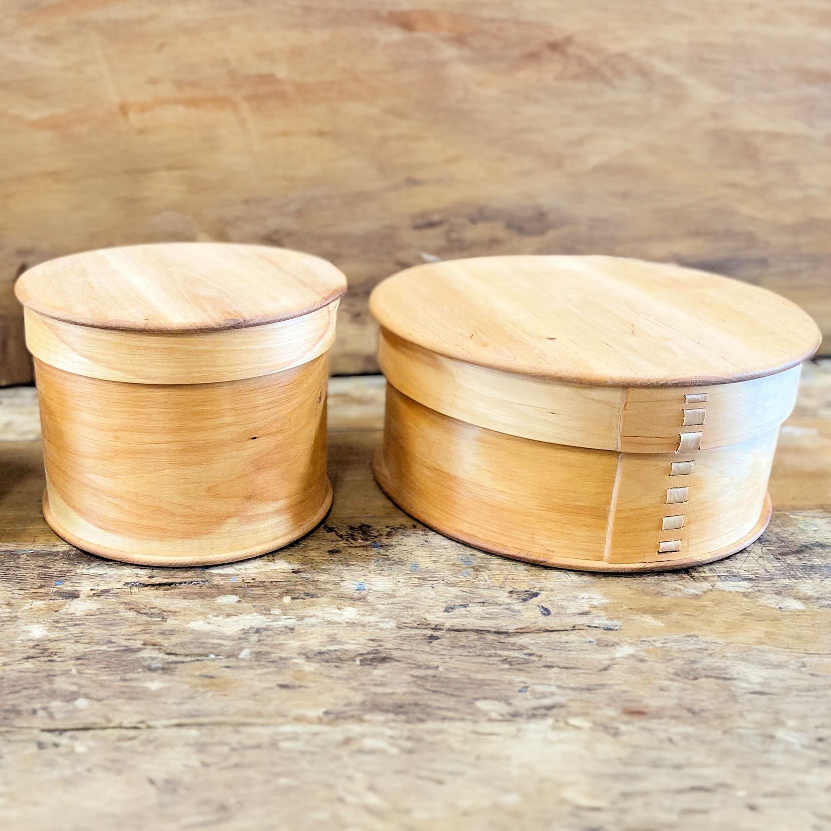 Svepask i oljad al med lock, tillverkad enligt traditionell teknik där tunna träspån formas och sammanfogas för hand. Den varma tonen i alen och den oljade ytan ger ett naturligt och tidlöst uttryck som passar lika bra för förvaring i kök och skafferi som på hyllan eller bordet.